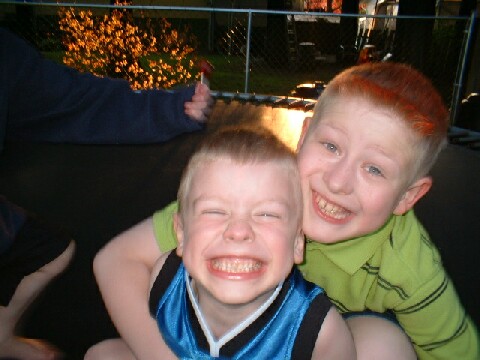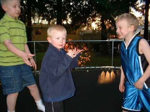 | みんなでトランポリンしてました。3人は全然疲れを見せないんだけど、私は数分一緒に飛んでるだけで呼吸困難に陥ります(笑) 一人がオニになって、目をつぶって10数えて、そのまま立たずに目も開けずに誰かを捕まえる・・ってゲームをよくやります。やつらは私がオニになり追いかけられるとかなり興奮して叫びながら逃げ回る。・・・だから叫んだら居る場所オニがわかっちゃうでしょ、アイザック! |