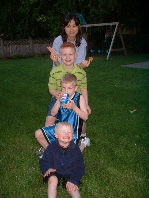 | ホストブラザーの3人兄弟です。下から4歳になりたてのウルトラワンパク少年アイザック、もうすぐ7歳の素直なソロモン、長男でやや落ち着いてる11歳のエブロン。一緒に移ってるコリアンの女の子はたまたま遊びに来てた元クラスメイト。 |