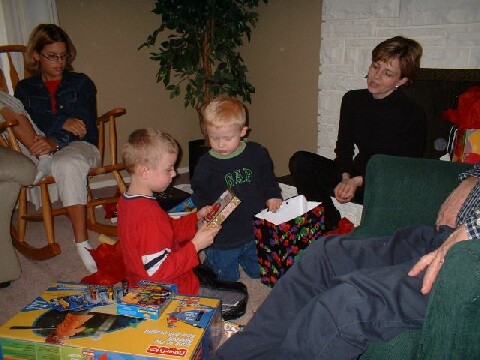 | これもアイザックの誕生パーティの時。みんなからたくさんのプレゼントをもらって一つ一つ空けてるシーン。ソロモンも興奮して一緒に空けるの手伝ったりしてます(笑)私はチョロQ(って表現古いか?)のデッカイ版みたいな車のおもちゃをあげました。 |