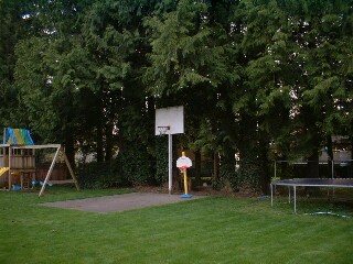 まず家の紹介。左はホスト宅正面の外観です。私はいつも左のガレージを周って裏口から入り、裏庭を通ってベースメント専用の入り口から家に入ります。でも正面のドアと同じ鍵を使っているので「正面ドアからいつでも入っていいよ」と言われてます。ガレージの前にある車が彼らの車で、私が車を買う前にバンクーバーへ行く時はこれでよくグレハンのバス停まで迎えに来てもらってました。 右は裏庭の写真。滑り台、ブランコ、バスケのゴール、トランポリンなど、元気な男の子3人がいつもここで遊んでいます。トランポリンは前のホストも持ってたしここの近所の家も殆ど持っていて、日本の家庭環境との違いを見せ付けられます・・。背の高い木も生えほんといい感じの庭です。 |