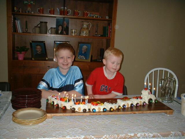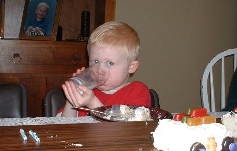 | これもアイザックの誕生パーティ。長男のエブロンとアイザックは二人とも誕生日が4月なんで、この日のケーキはアイザックと一緒にもう一度二人のお祝い。ケーキに目が釘付け状態のアイザックの表情がなんともかわいい。 |